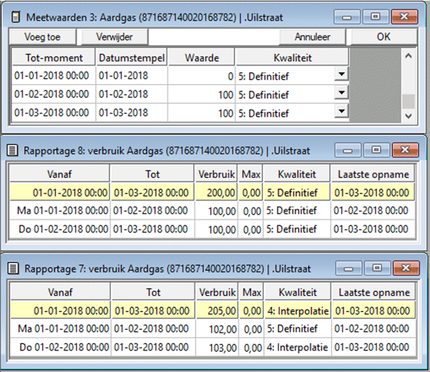 In het voorbeeld hieronder zien we een bovenaan gasmeter met opname eens per maand. Wanneer we de verbruiken per maand opvragen krijgen we een overzicht zoals in het midden is weergegeven.